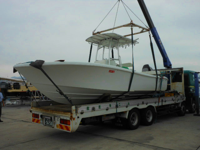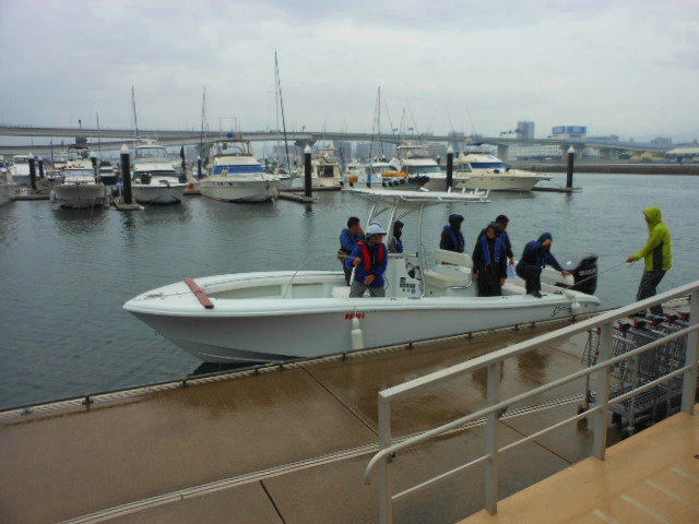 開催日の前日に新商品のDF350Aを搭載した試乗艇の引き取りを手伝い